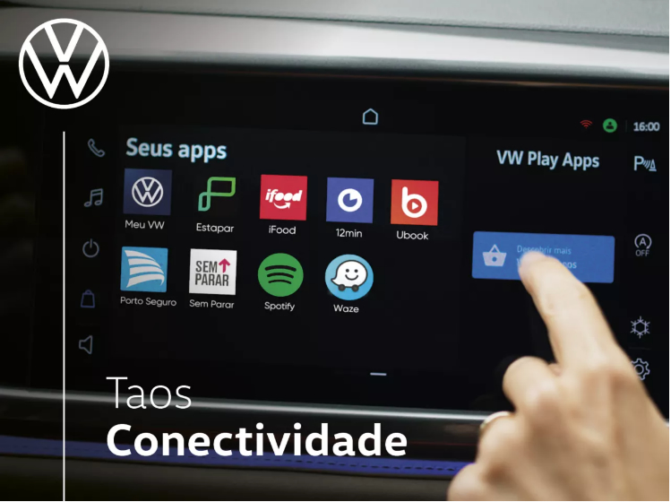O Taos é conectado com seu smartphone, com as últimas tecnologias e, claro, com você. Conheça os recursos de conectividade do nosso novo SUVW e Sinta, Conecte, Proteja, Apaixone-se.
